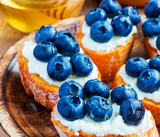 - 2. En un tazón pequeño, combine el queso ricotta, las 2 cucharadas restantes de jugo de limón y la ralladura de limón. Unte las rebanadas de baguette con la mezcla de queso ricotta. Coloque arándanos asados sobre el queso. Rocíe cada rebanada de baguette con miel y sirva.