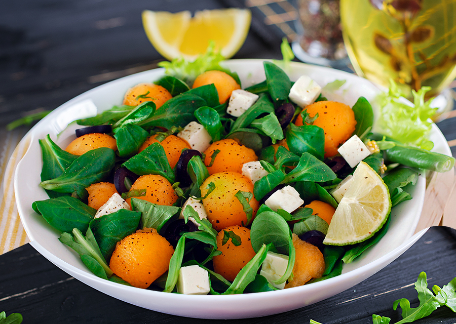 Ensalada de melón y rúcula con aderezo de miel y lima