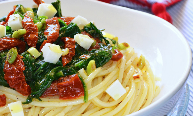 - Mezcle los espaguetis con los tomates secos y las espinacas. Incorpore ½ taza de agua de la pasta. Sazone con sal y pimienta. Espolvoree los espaguetis con queso feta y chips de ajo tostados. Sirva caliente.