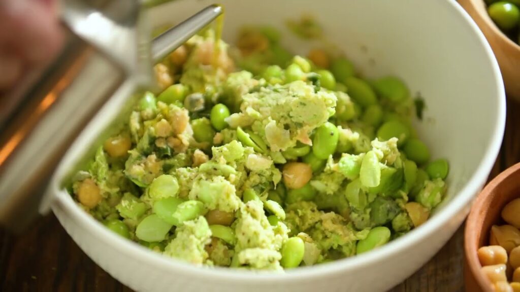 - 1. Reserve una cucharada de edamame y otra de garbanzos para decorar. En un procesador de alimentos, licúe el edamame y los garbanzos restantes con ajo, albahaca, jugo de limón, sal y pimienta. Vierta lentamente el aceite de oliva por la boca de llenado mientras el procesador está encendido. Procese hasta obtener una mezcla suave y homogénea. Añada sal y pimienta al gusto.