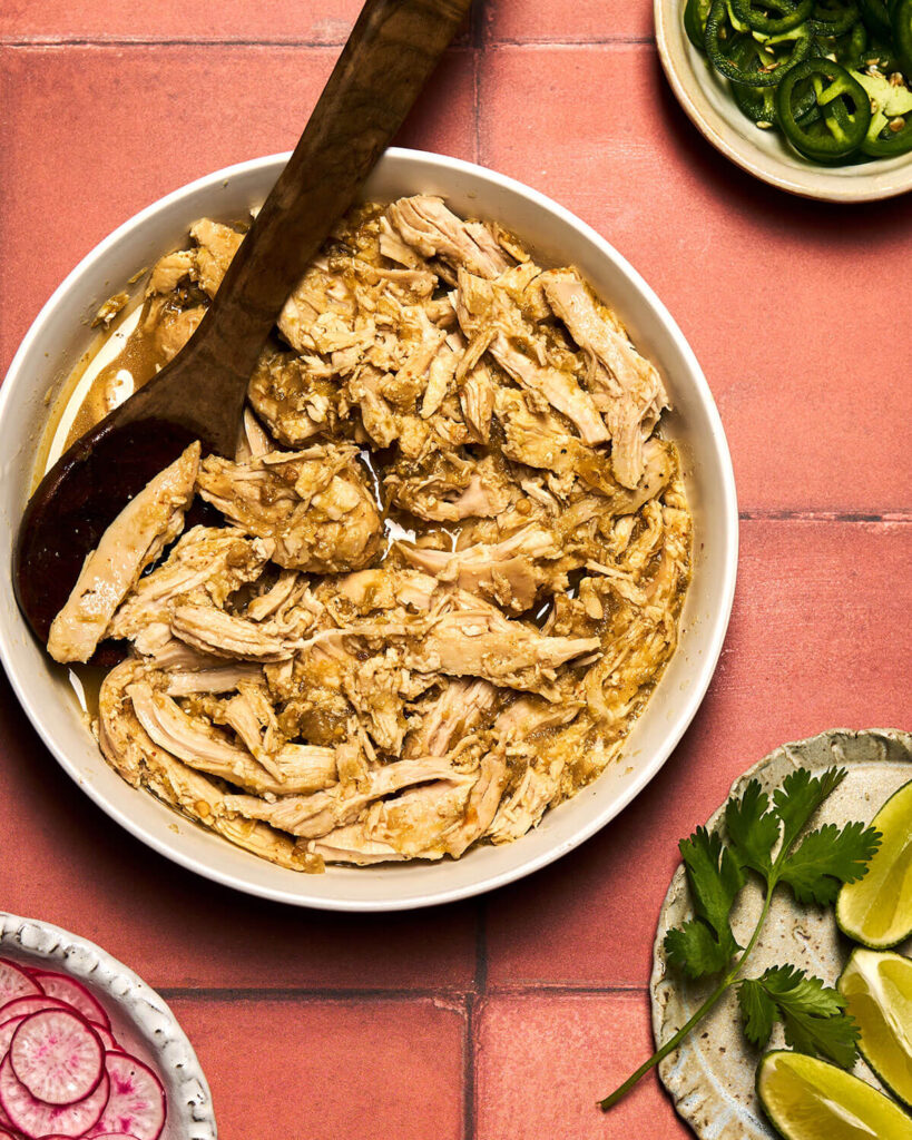 - 6. Una vez cocido el pollo, con una espumadera, retire los trozos a una tabla de cortar, desmenúcelo y regréselo a la olla de cocción lenta con la salsa de chile verde. Sazone con sal y pimienta al gusto. Sirva caliente con tortillas, frijoles y arroz.