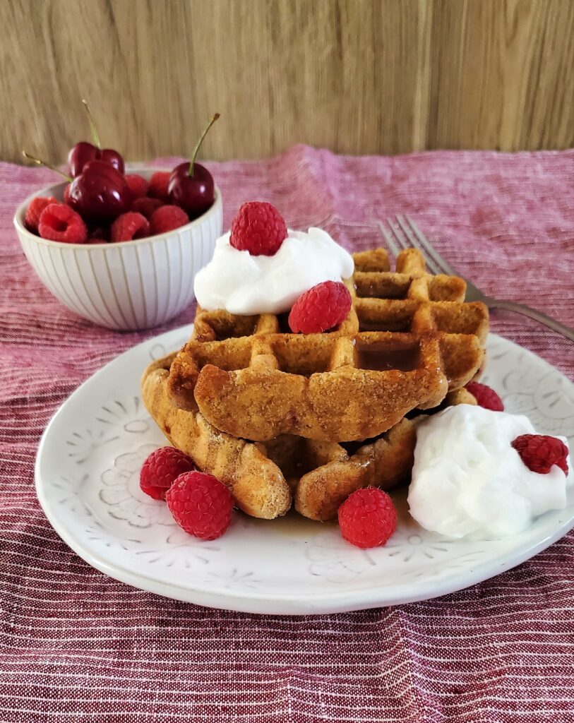 Waffles de coco y frambuesa servidos con cremosa crema batida de coco: ¡la rtostada francesaChica… hasta que hicimos waffles de coco y frambuesa con crema batida de coco. ¡Estos waffles me sorprendieron gratamente y me convirtieron en una amante de los waffles!